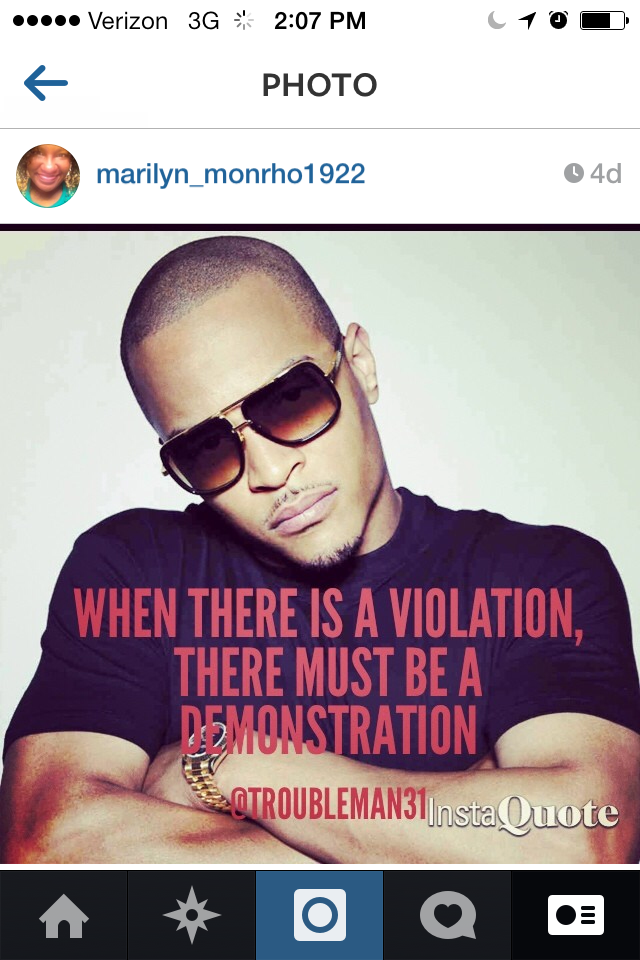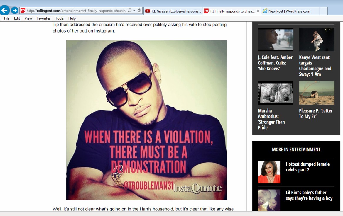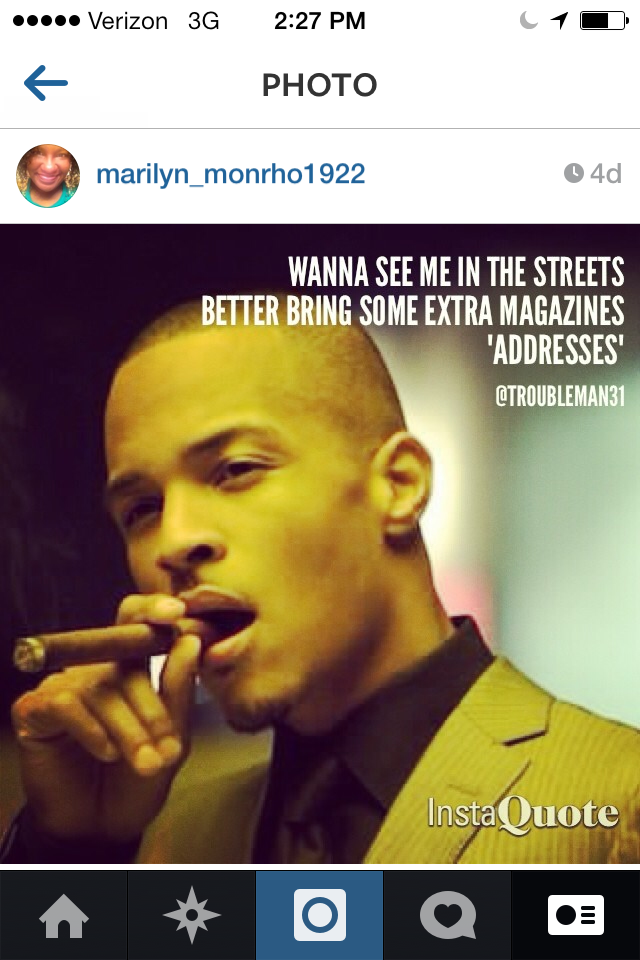 Moreover, I didn’t expect for anything else to come of the picture. Since I did use to blog about celebrities, I still follow some online magazines and blog sites. I actually receive a daily email from a few including Rolling Out Magazine. I visited the website to read an article about Michael Ealy’s son and saw the headline, “T.I. Finally Responds to Cheating Rumors.” I read the article and my mouth dropped open when I saw my InstaQuote picture being tied in with his “alleged” response to photos of his wife, Tiny: