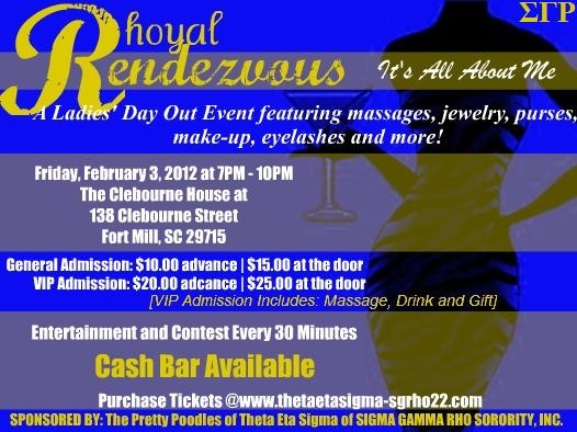 Please join the lovely ladies of the Theta Eta Sigma Chapter of Sigma Gamma Rho Sorority, Inc. for “Rhoyal Rendezvous: It’s All About Me.” The event will take place on Friday, February 3, 2012 from 7-10pm at The Clebourne House located at 138 Clebourne St Fort Mill, SC.